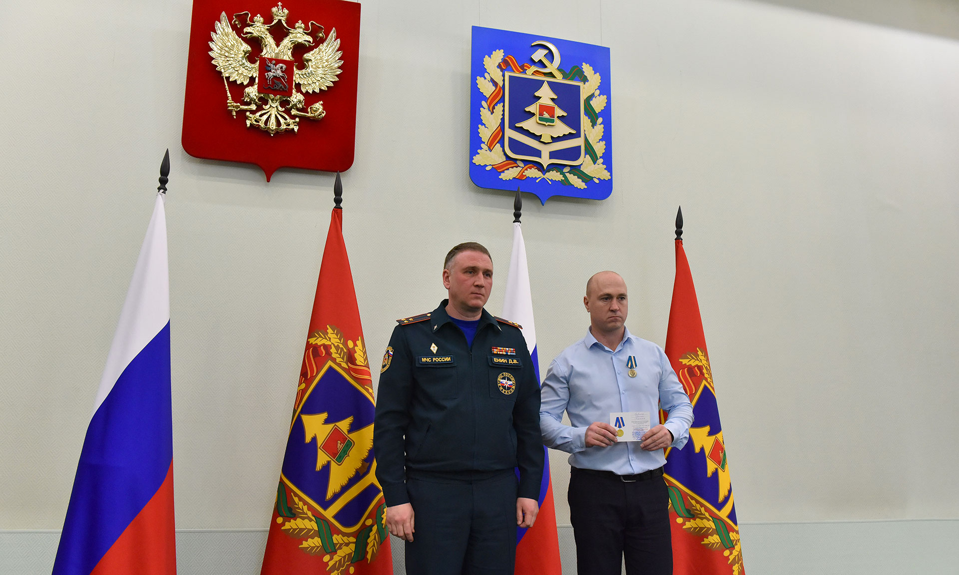 Начальник Главного управления МЧС России по Брянской области полковник внутренней службы Дмитрий Енин вручил награды МЧС России. Приказами МЧС России за заслуги в реализации единой государственной политики в области гражданской обороны, защиты населения и территорий от ЧС, обеспечения пожарной безопасности и безопасности людей на водных объектах медалью МЧС России «За содружество во имя спасения» награждены:
