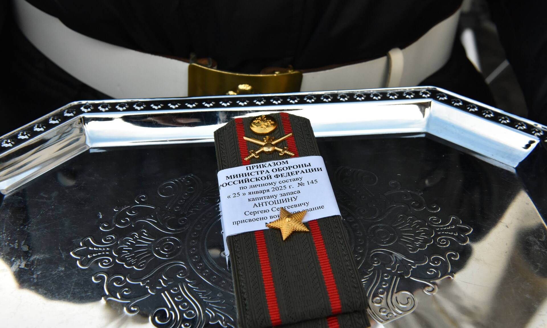 Начальник Главного штаба Сухопутных войск генерал-полковник Евгений Никифоров огласил приказ Министра обороны о присвоении командиру бригады «БАРС-Брянск» звания майора, вручил Сергею Антошину погоны.