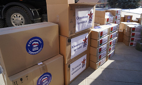 В составе гуманитарной помощи продовольственные наборы, бутилированная питьевая вода, средства гигиены, материал для плетения маскировочных сетей, спортивная форма для детской, юношеской и основной футбольных команд Брянки.