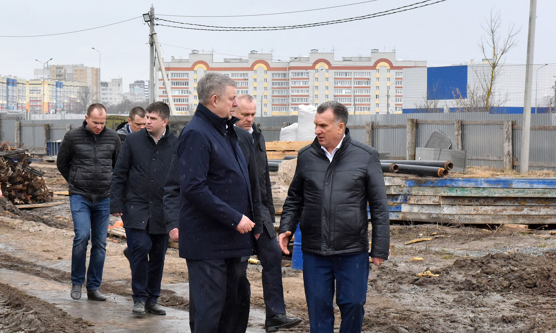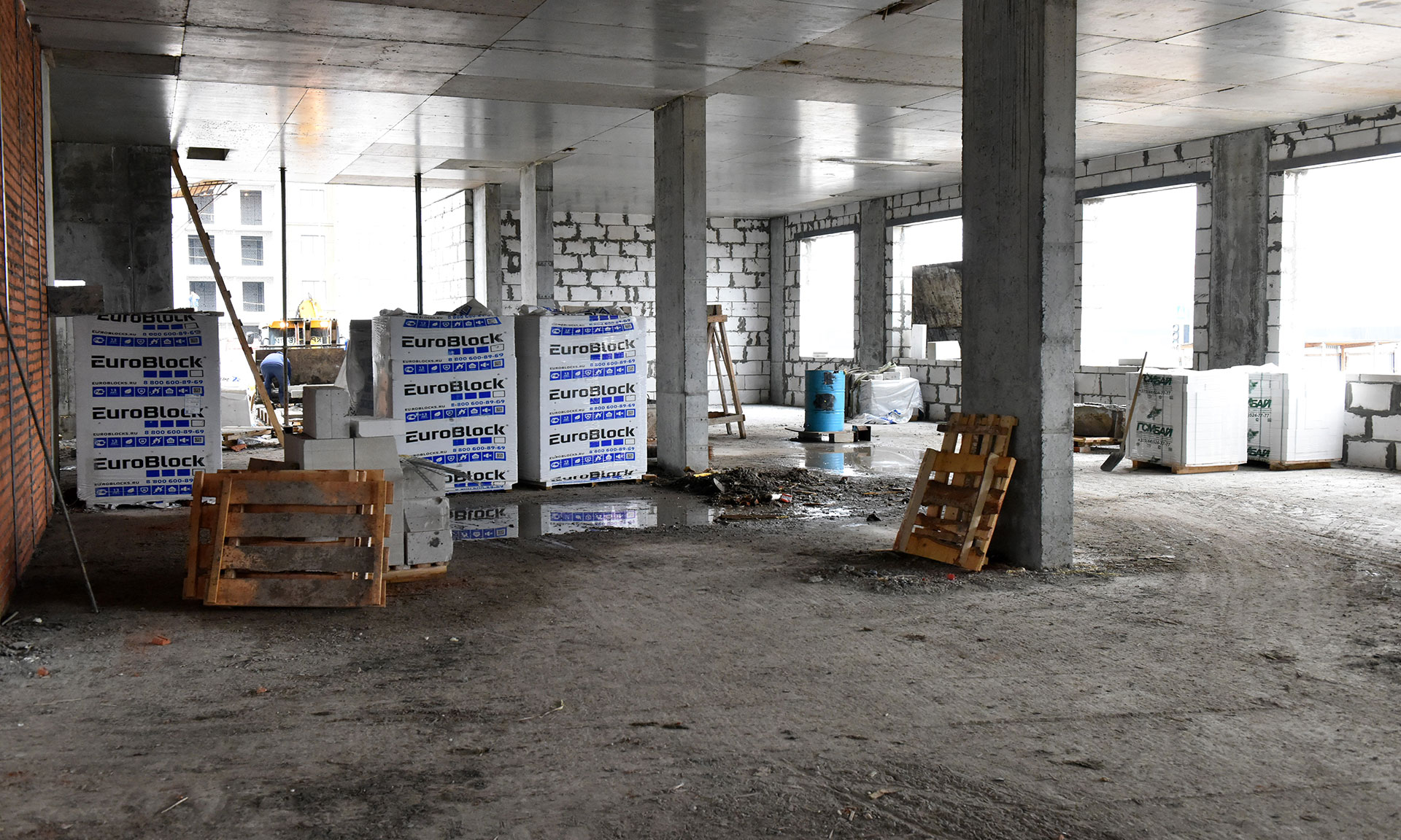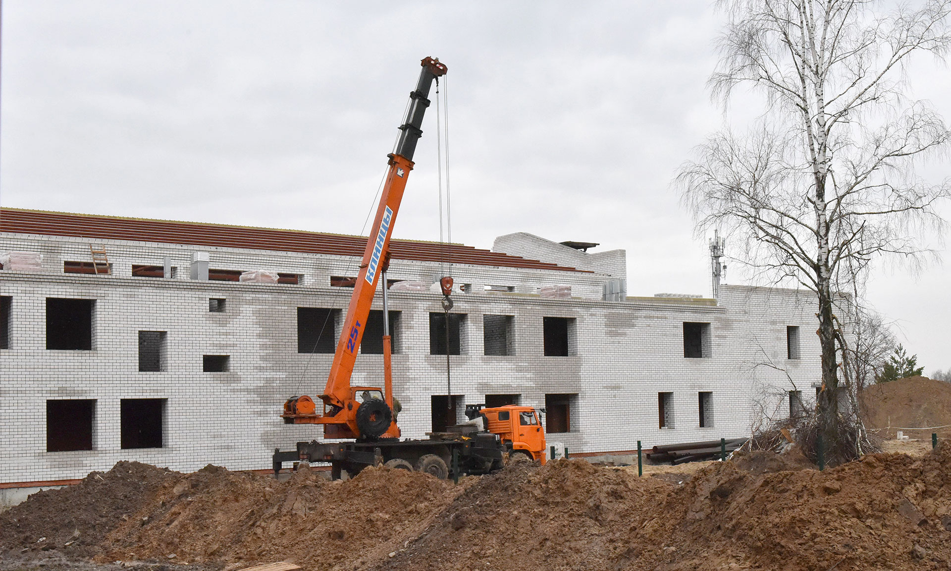 Здесь ведутся работы по устройству внутриплощадочного водопровода, формирование ростверков, вертикальная гидроизоляция, засыпка грунта под полы, прокладка инженерных коммуникаций. В среднем на объекте работают около 60 человек.