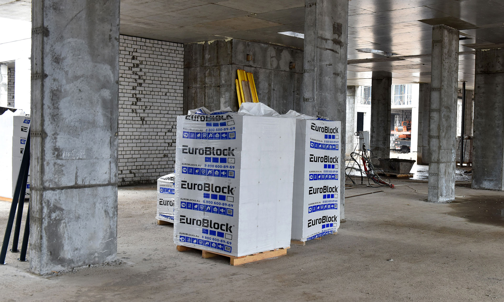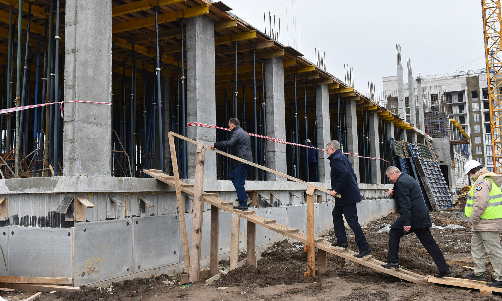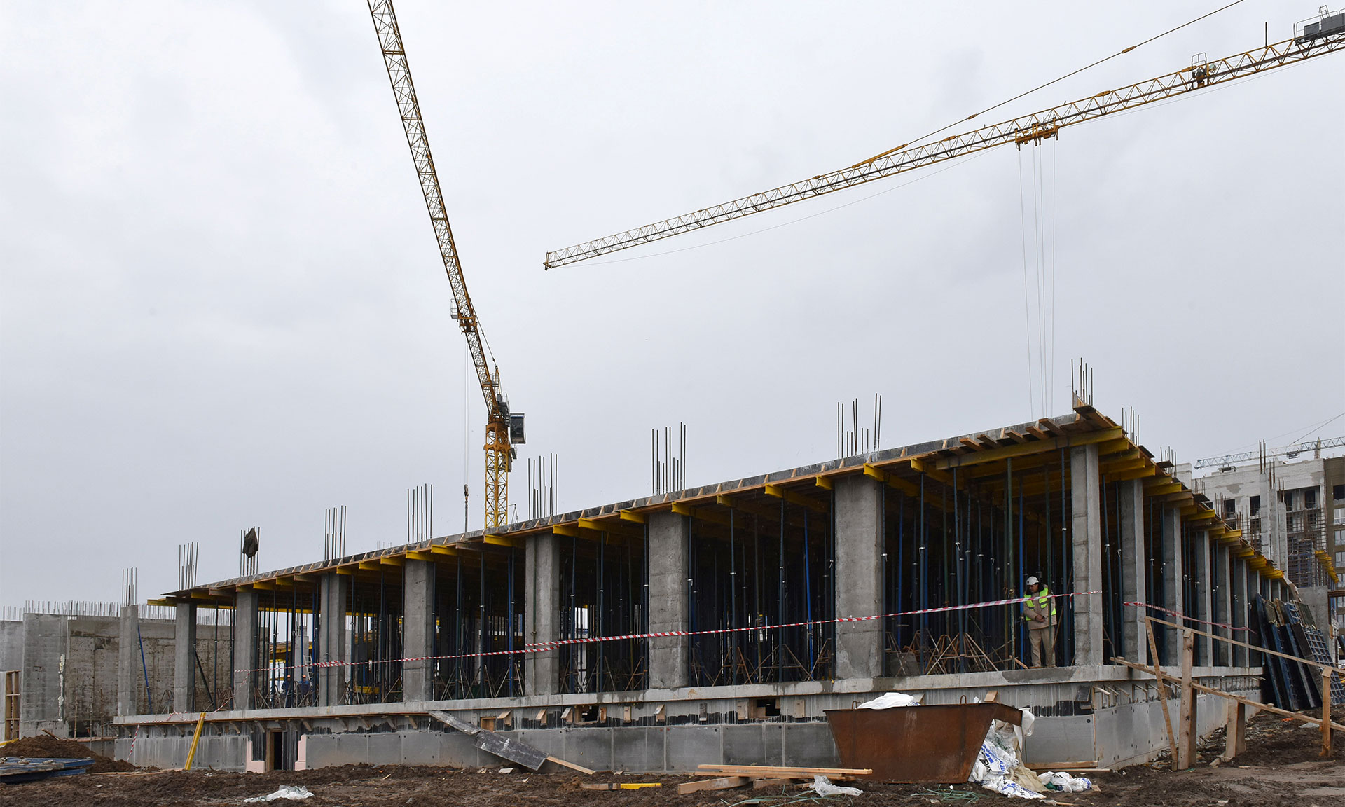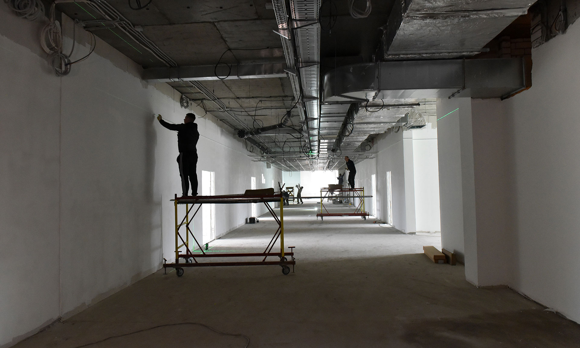 Здесь ведутся работы по устройству внутриплощадочного водопровода, формирование ростверков, вертикальная гидроизоляция, засыпка грунта под полы, прокладка инженерных коммуникаций. В среднем на объекте работают около 60 человек.