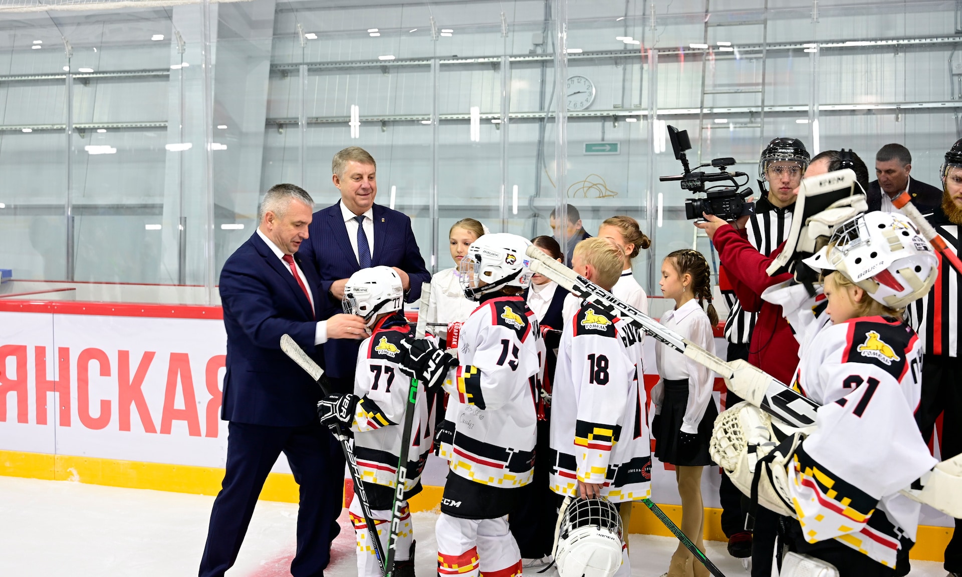 Этот ледовый дворец у нас уже 14-й, и практически готов 15-й в Глинищеве, где уже заливают лед. Пятнадцать ледовых дворцов по всей области, которые позволят нам готовить будущих Харламовых, Петровых, Михайловых, и, я уверен, через 10–15 лет мы увидим нынешних начинающих хоккеистов уже на больших ледовых аренах!