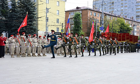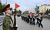 Торжественным маршем прошли кадеты Клинцовской кадетской школы «Юный спасатель» имени героя Советского Союза С. И. Постевого, коробки юнармейцев, сводный военный духовой оркестр Брянской области.