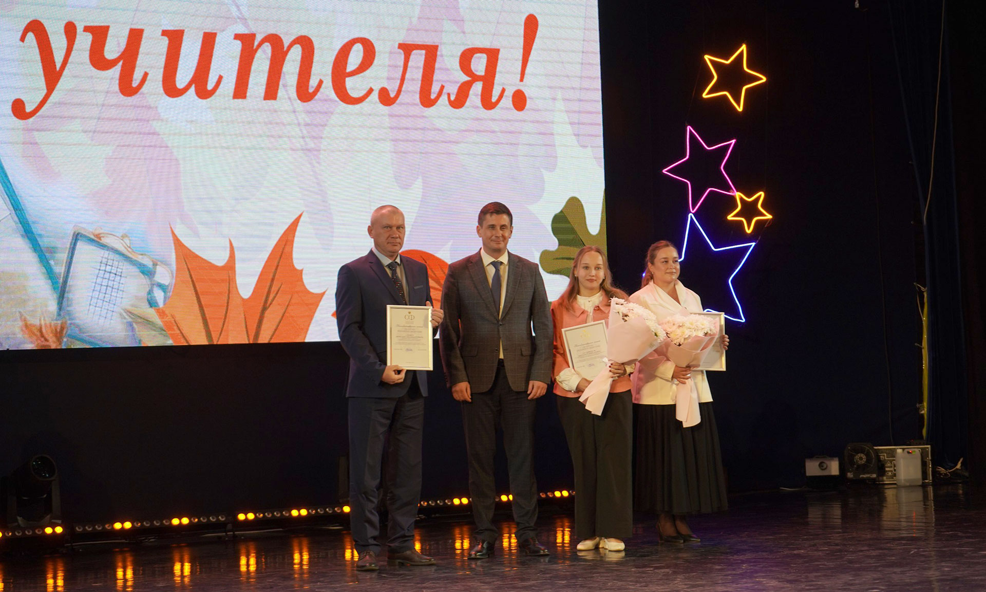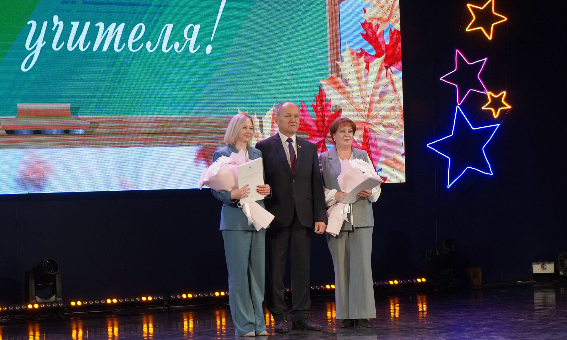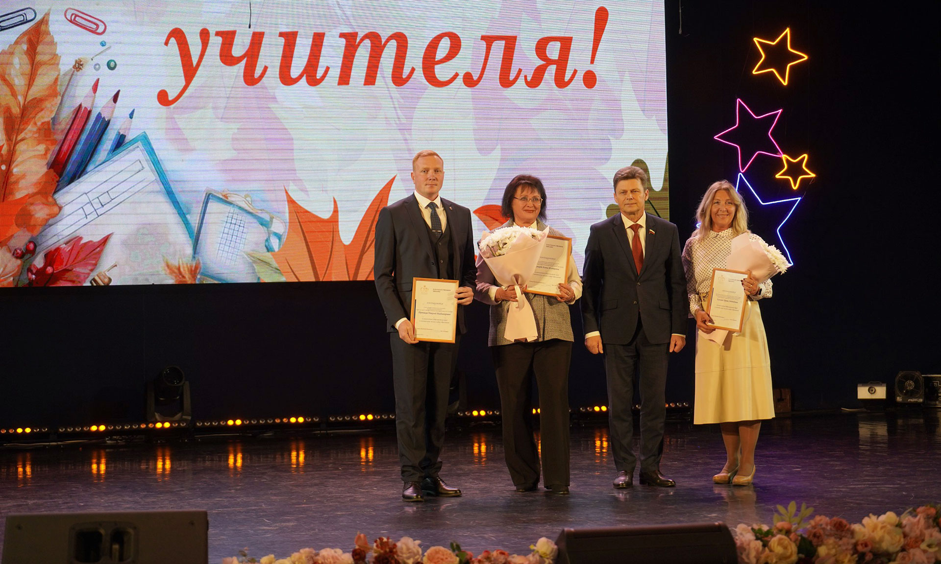 Со словами поздравления к учителям обратились заместитель председателя Брянской областной Думы Владимир Пронин, федеральный инспектор по Брянской области Игорь Фильченков, сенаторы Российской Федерации Василий Попадайло и Вадим Деньгин, председатель комитета Государственной Думы Федерального Собрания Российской Федерации по физической культуре и спорту Олег Матыцин, депутат Государственной Думы Николай Щеглов. За заслуги в труде и плодотворную работу в сфере образования лучшим педагогам вручены заслуженные награды.