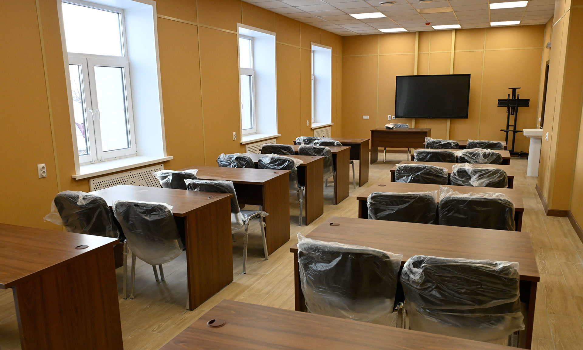 Завершены отделочные работы, установлены двери, завозится мебель, комплектуются лабораторные помещения. Сейчас строители работают в цокольном этаже — там обустраивают пищеблок и столовую, гардероб.